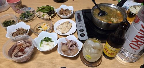 午後もコタツで聖教新聞を読んだり、iPadゲームをしたり… 今日は結局、一歩も外出せず 夜ごはん…ありもので 年末に作った酢だこ、らっきょ酢がやっぱいちばん旨い 今夜はホッピーで 今ある鍋はこれでラスト 冷凍させておいた11月30日に買った魚を焼く カミさ…