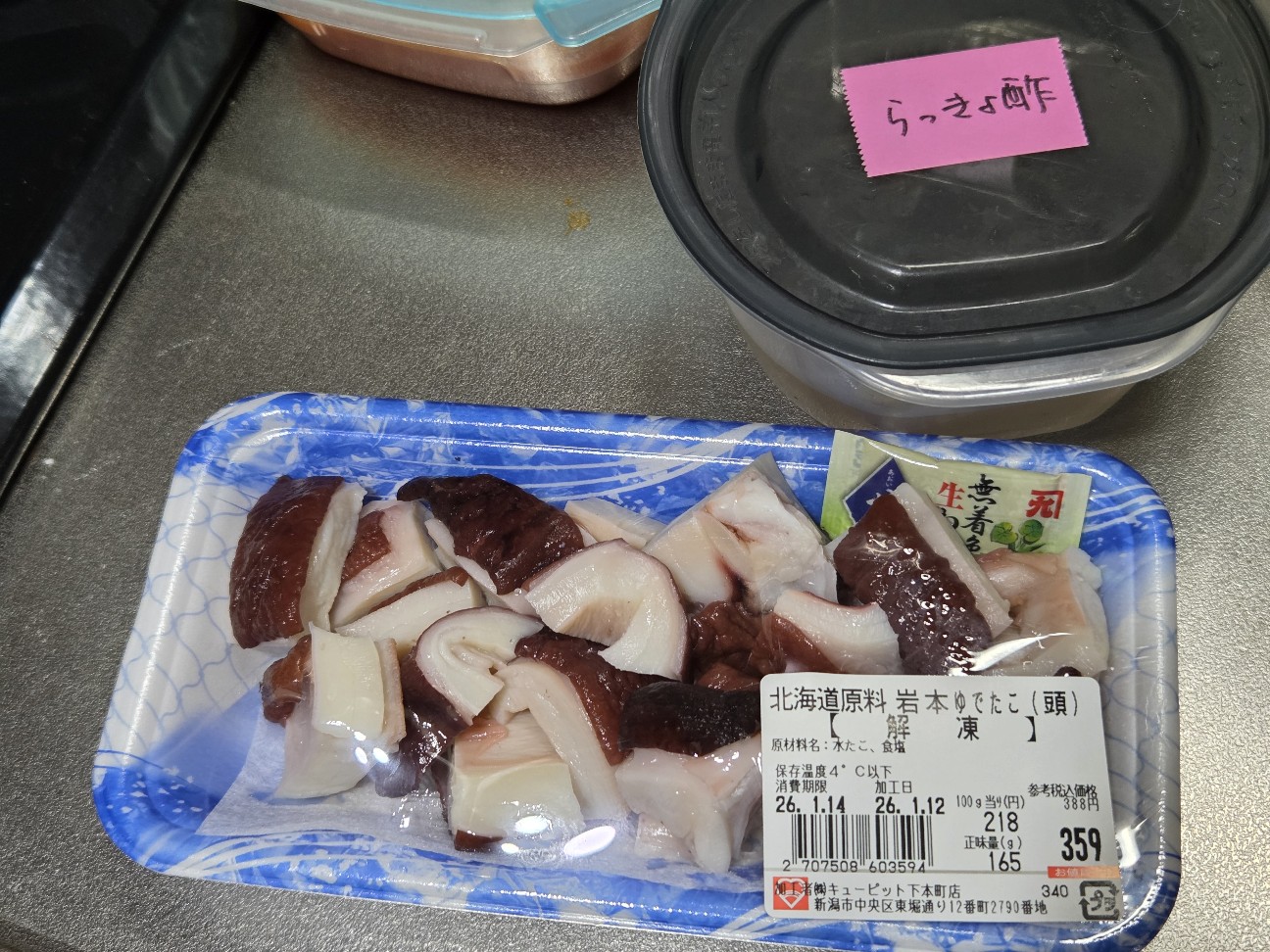 早めの昼ごはんを済ませたら、休みのカミさんが買ってきてくれたタコぶつをらっきょ酢に漬ける(浸ける?🤔)